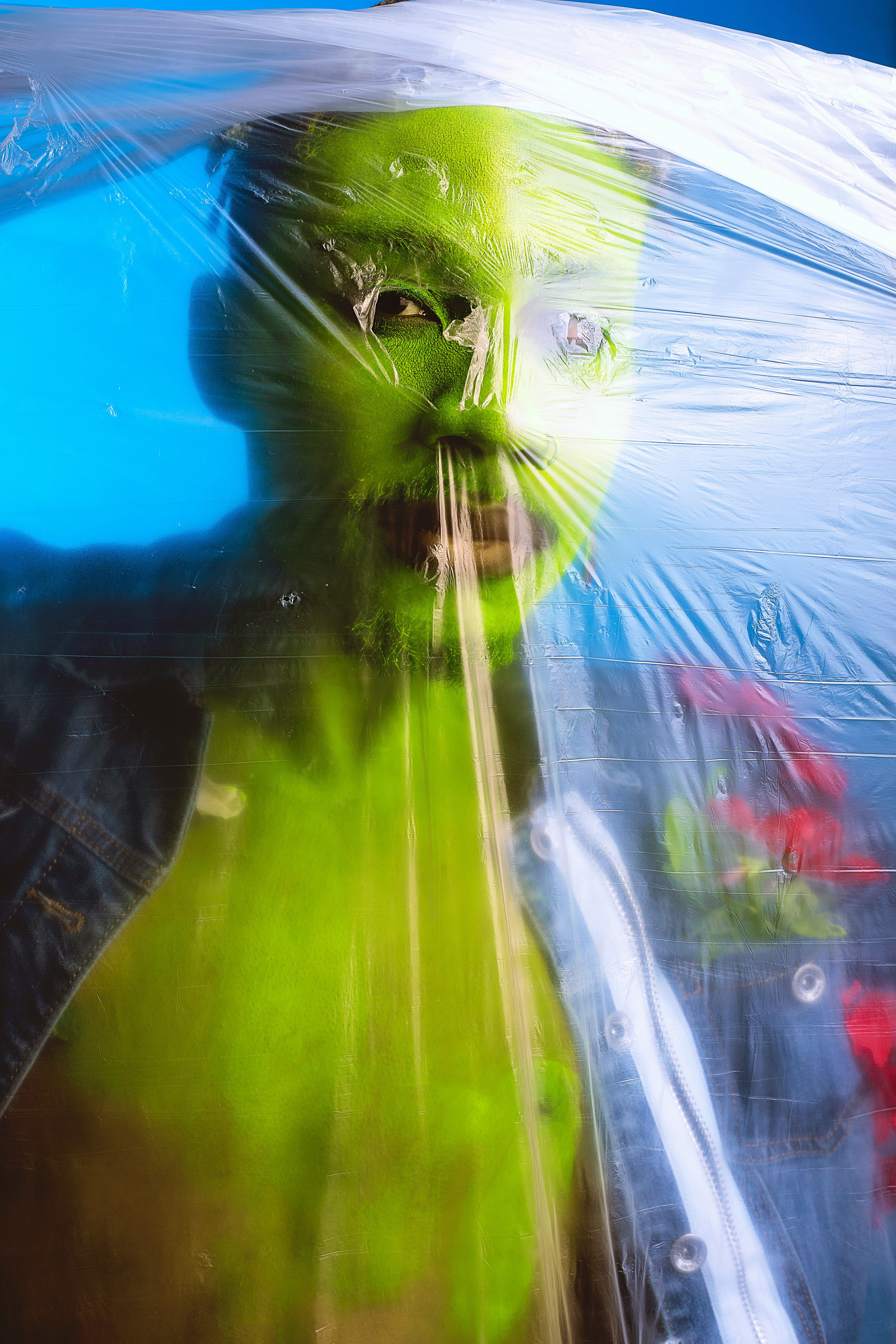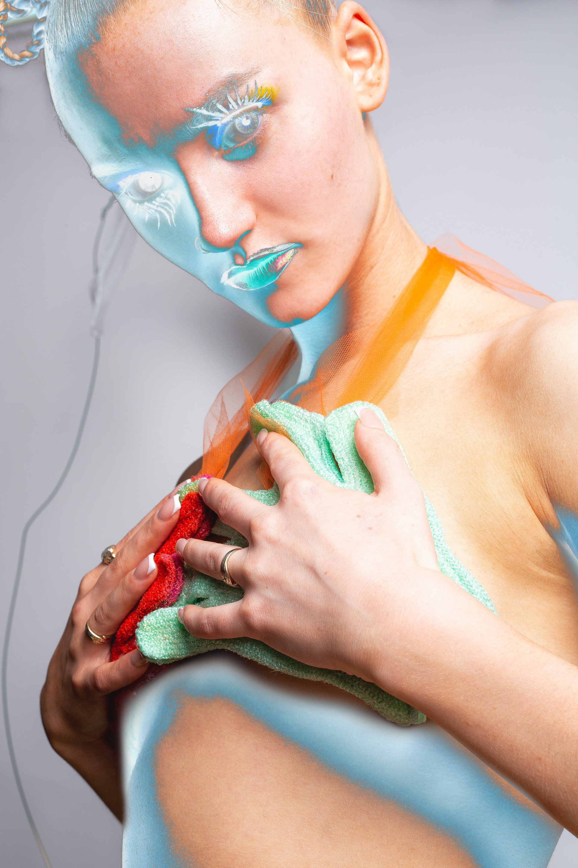 Our female model, Ela Judge, wore a gorgeous hand-crafted skirt curated out of woolly hats. This outfit was inspired by the amazing work of Nicole McLaughlin. To complement the look, Ela wore a bralette made out of exfoliating gloves, which were hand-dyed to match the shoot’s color palette. Ela’s look represents an individual who is striving to be sustainable. Previously, they were a notorious fast fashion shopper. As a result of their shopping habits, they were left with too many hats and too many gloves. Having seen the rise of sustainability campaigns and the popularization of upcycling, Ela’s character decided to take matters into her own hands.